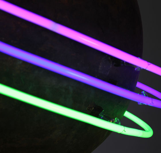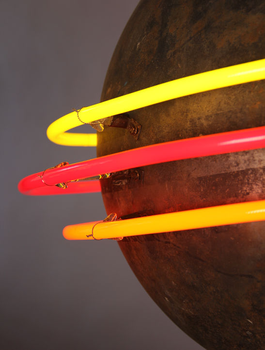 This sphere boasts bold colors of a glowing sun, around its swirling mass of molten surface. This is the only piece to date that I have incorporated red, yellow and orange neon. It balances the cool colors of the Peaceful Planet. It is hot, sassy and demands attention in its planetary system.
